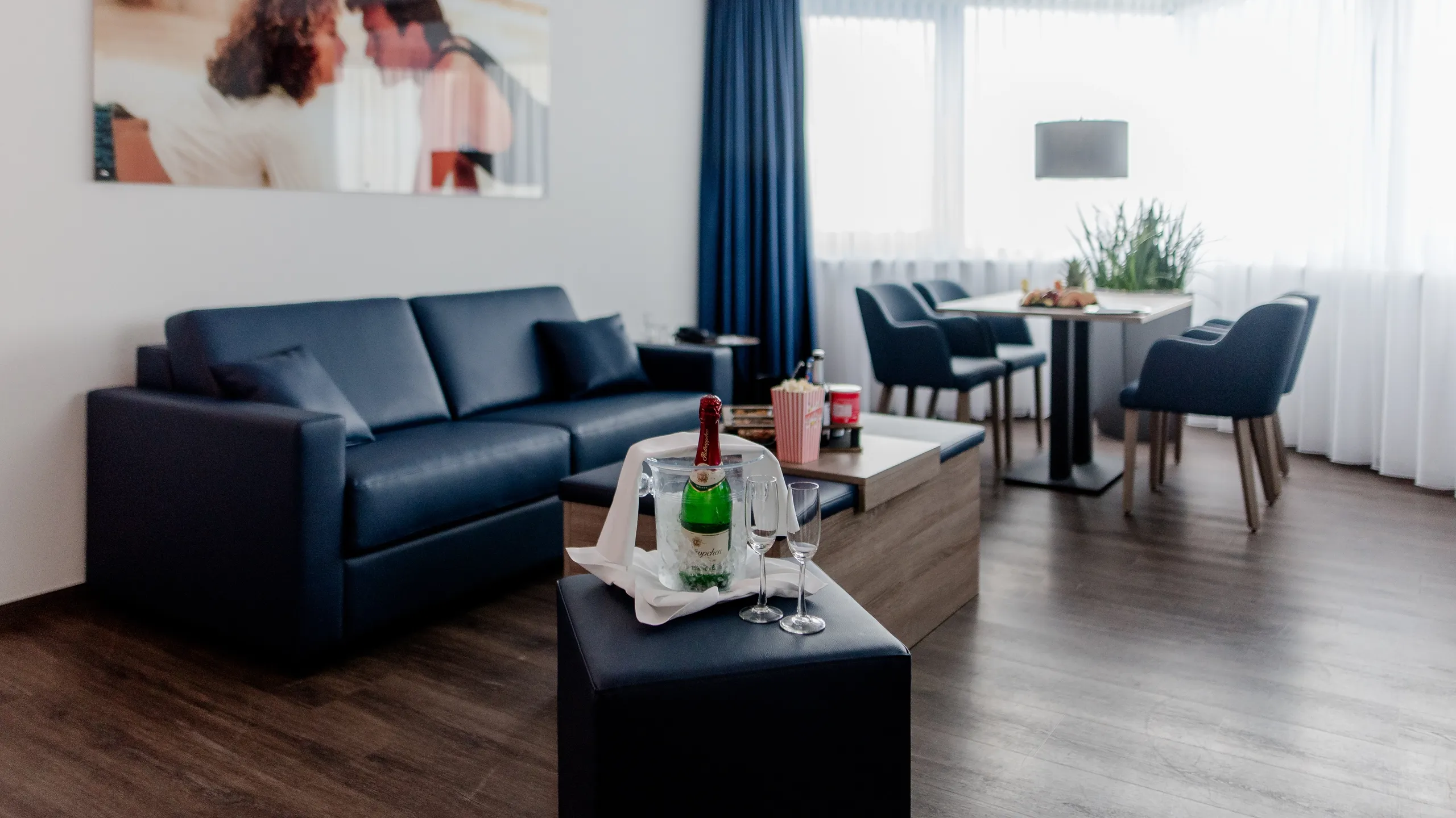 Suite bestehend aus 2 separaten Räumen (1. Kino-Ess-Spa-Bereich und 2. Schlaf-Schreibtisch-Bereich) und (3.) Badezimmer auf insgesamt ca. 55 m²! Entspannen Sie in unserer exklusiven Kino-Wellness-Suite "Titanic" bzw. "Dirty Dancing" auf über 55 m²! Die modern eingerichtete Suite verfügt über getrennte und Wohn-, Schlaf- und Badezimmerräume und bietet mit liebevoll gestalteten Kino-, Dinner-, Büro- und Beauty-Bereichen alle Möglichkeiten für einen Hotel-Aufenthalt in Leipzig der keine Wünsche offen lässt. Erfüllen Sie sich mit dieser luxuriösen Kino-Wellness-Suite in Leipzig gleich mehrere Träume auf einmal! Mit dem eigenen Whirlpool mit (dimmbar-) beleuchteten Sternenhimmel und dem separaten Dinnerbereich im Erker der Hotel Suite eignet sich die Wellness-Suite besonders für einen romantischen Aufenthalt oder ein Wochenende Leipzig! Der Wohn- bzw. Home-Kino-Bereich besticht durch seinen Samsung HD 75" Smart-TV mitsamt Soundbar, die gemütliche Kinocouch, die wir auf Wunsch als Schlafsofa aufbauen können (Tipp: die Suite ist dadurch natürlich auch sehr gut geeignet für ein Familien Leipzig Urlaub) und dem passenden Blue-Ray-Player mit großer Kino-Leih-Filmauswahl! Mitsamt Popcorn und Snacks verwandeln wir Ihren Hotelaufenthalt in ein echtes Kino-Erlebnis! Das separate Schlafzimmer mit Boxspringbett, Schreibtischbereich, zusätzlichem großen Flachbild-TV, Lesesessel, begehbaren Kleiderschrank, Safe, Nespresso Kaffeemaschine und Minibar lassen keine Wünsche an Ihren Leipzig Hotel Aufenthalt offen. Das traumhafte moderne Designer-Badezimmer mit WC, großer begehbarer Regendusche, Spiegel- und Schminkspiegel, sowie Fön und Badezimmeraccessoires rundet das Wellness-Suite-Paket perfekt ab. Buchen oder verschenken Sie jetzt den perfekten Leipzig Urlaub als Romantik Wochenende oder Familien Kurztrip in einer der Kino-Wellness-Suiten des Atlanta Hotel Leipzig!