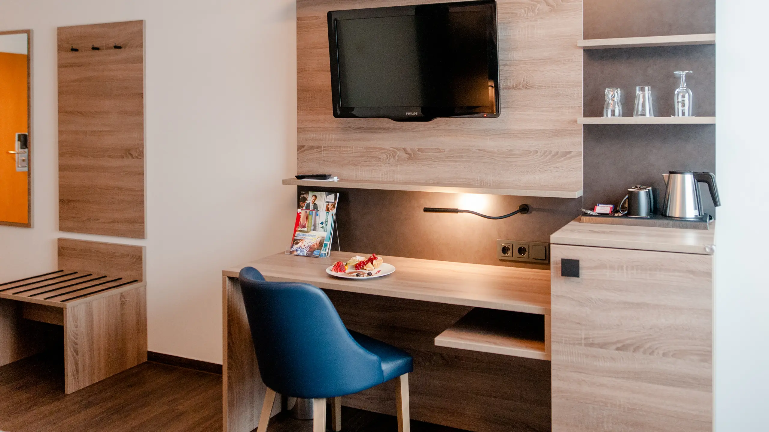 Sehr komfortabel und modern ausgestattete Zimmer mit Flat-TV, kostenfreiem Premium W-Lan, Kaffee-/Teekocher, Zimmer-Safe, Minibar, beste Boxspringbetten und Matratzen von der FBW.