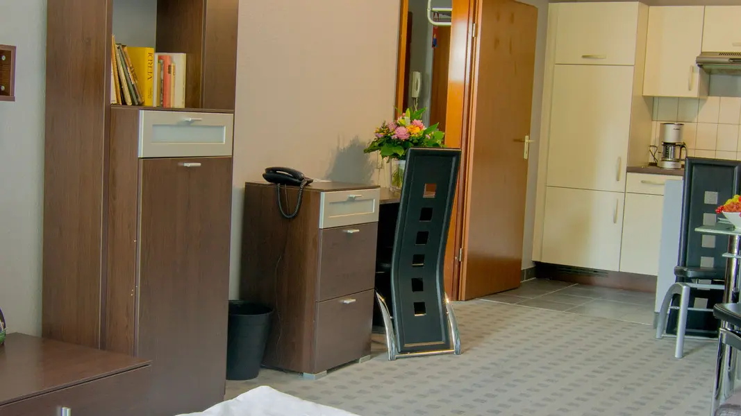 Wohn-/Schlafzimmer mit Sessel, Einbauküche, Esstisch mit Stühlen, Wohnwand, TV mit Radio, Schreibtisch, Kleiderschrank, 2 x 90 cm x 200 cm Betten, Badezimmer mit Dusche / WC und Fön, PayTV. Serviceleistungen, wie z.B. Reinigungs- und Wäscheservice, kostenfreies W-LAN sowie die Nutzung des Wellness- und Fitnessbereiches des angebundenen 4-Sterne-Hotels runden das Angebot für den Geschäfts- oder Privatreisenden von heute ab.
