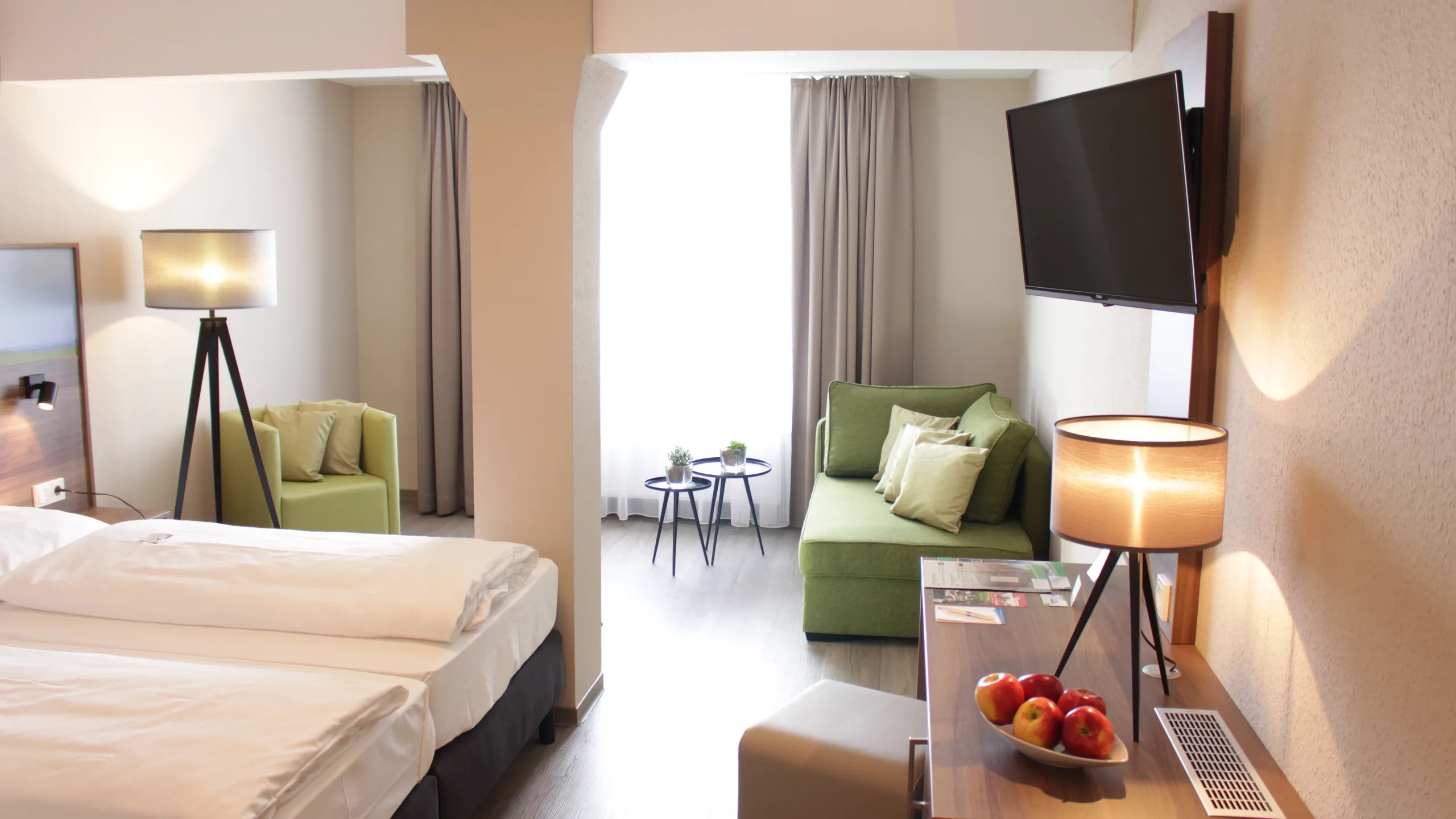 Wohn-/Schlafzimmer mit Sessel, Esstisch mit Stühlen, Wohnwand, TV mit Radio, Schreibtisch, Kleiderschrank, 2 x 90 cm x 200 cm Betten, Badezimmer mit Dusche / WC und Fön, PayTV . Serviceleistungen, wie z.B. Reinigungs- und Wäscheservice, kostenfreies W-LAN sowie die Nutzung des Wellness- und Fitnessbereiches des angebundenen 4-Sterne-Hotels runden das Angebot für den Geschäfts- oder Privatreisenden von heute ab.
