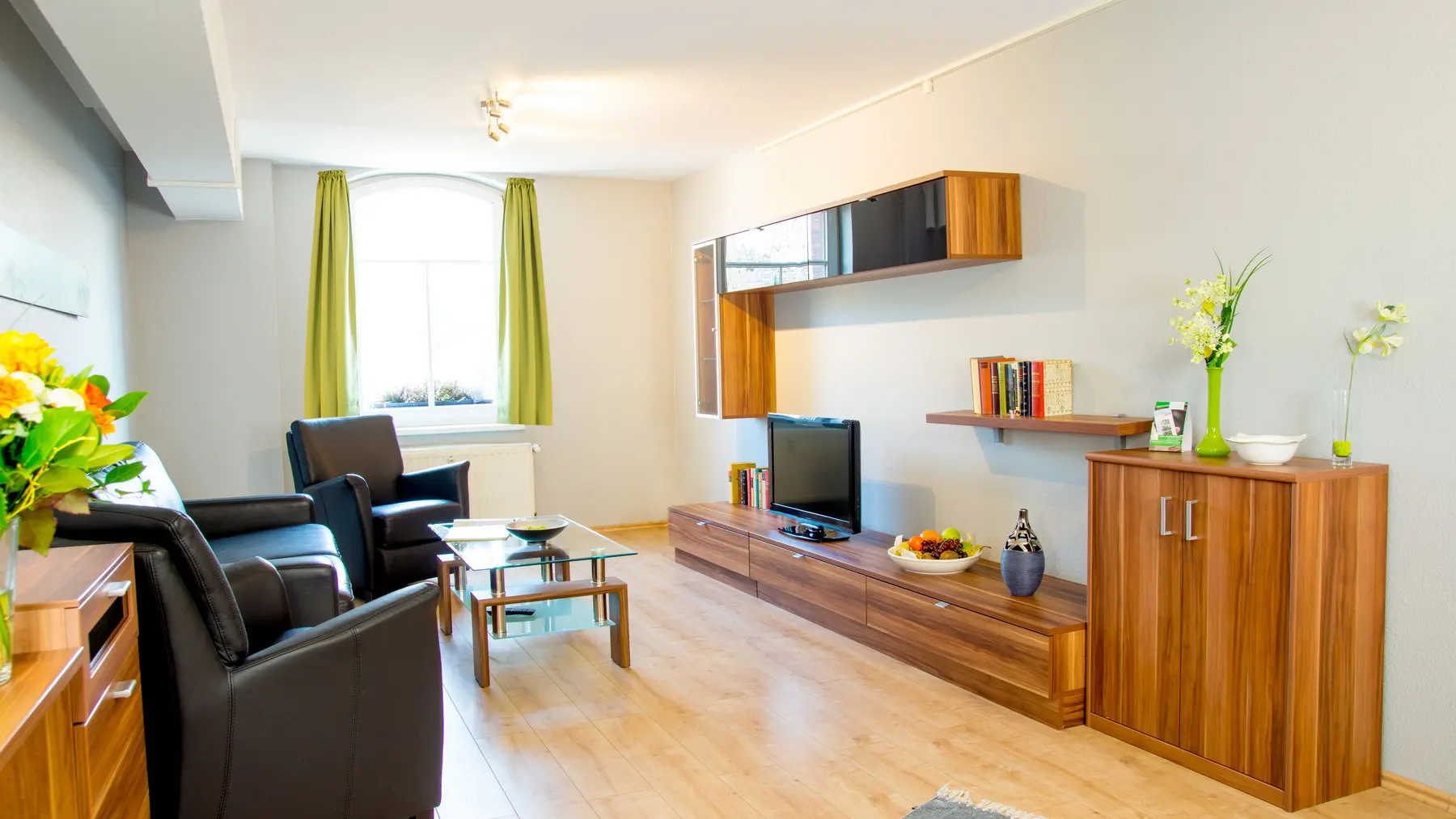 Wohnzimmer mit ausziehbarer Schlafcouch, Sessel, Esstisch mit 4 Stühlen, Wohnwand, TV mit Radio, Schreibtisch, Einbauküche mit 4 Kochplatten, Kühlschrank mit Gefrierfach, Herd, Kaffeemaschine, Wasserkocher. Geschirr, Besteck und Gläser können an der Rezeption gegen Gebühr von € 8,50 bestellt werden. Ebenso verfügt das Appartement über ein separates Badezimmer mit Dusche / WC und Fön und ein Schlafzimmer mit großem Kleiderschrank, 2 x 90 cm x 200 cm Betten, PayTV. Serviceleistungen, wie z.B. Reinigungs- und Wäscheservice, kostenfreies W-LAN sowie die Nutzung des Wellness- und Fitnessbereiches des angebundenen 4-Sterne-Hotels runden das Angebot für den Geschäfts- oder Privatreisenden von heute ab.