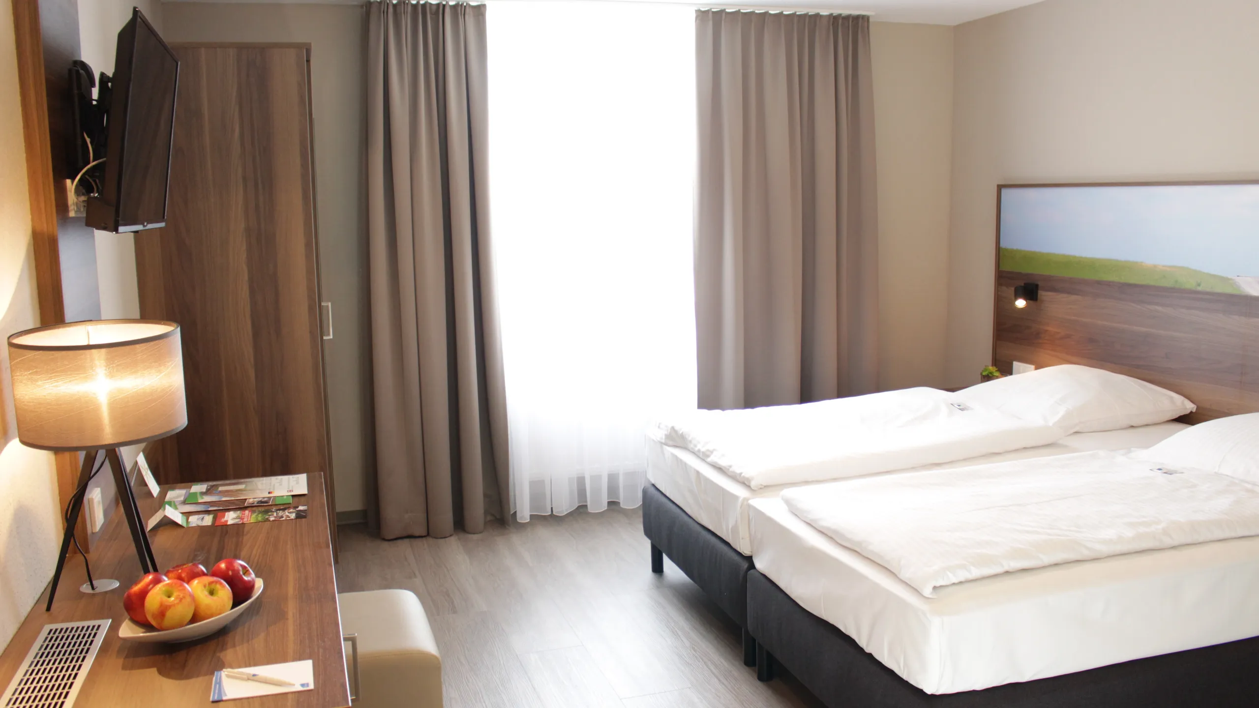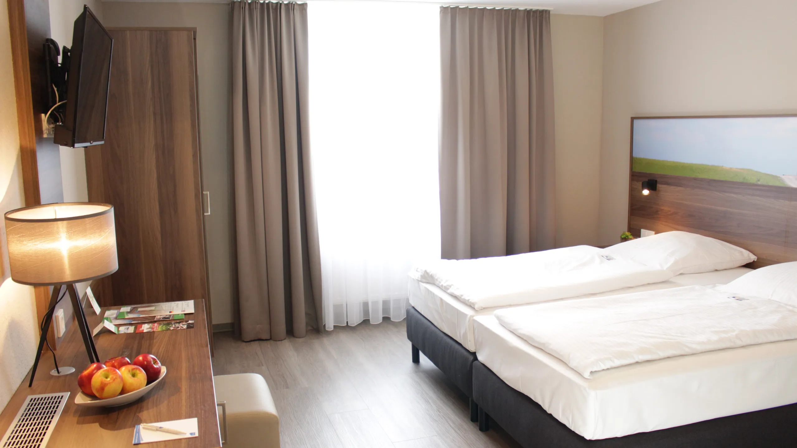 Die Komfort plus Doppelzimmer wurden 2017 renoviert und sind perfekt geeignet für Geschäftsreisende, Touristen und Liebespaare die ein Auge für das „kleine Plus“ haben und für die „es gerne ein bisschen extra Luxus sein darf“. Neben dem neuen Erdtonfarbkonzept, großen bodentiefen Fenstern, Deckenleuchte, Bettläufern, extra Kissen und gemütlichen Sesseln besticht das Komfort Plus Zimmer mit großzügigen 26m² Fläche, einem komfortablen Doppelbett, Schreibtisch, Nachttisch inkl. einzeln steuerbaren Lampen, Kofferablage, großem Kleiderschrank, Telefon, WLAN, Flachbild TV, Safe und zeitlos gefliestem separatem Badezimmer mit Dusche, WC, Schminkspiegel, Waschbecken und Fön bietet das Doppelzimmer alles was man in einem 4-Sterne Hotel erwarten darf. Durch die Lage größtenteils im 3. und 4. OG, die bequem per Fahrstuhl erreichbar sind, sind die Zimmer zudem besonders ruhig gelegen und bieten so zusätzlich das „kleine Plus“ für unsere Gäste.